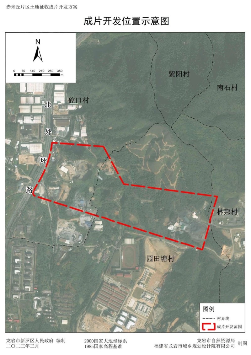赤米丘片区用地位置为西陂街道硿口村、西城街道西安社区,铁山镇林邦村;用地面积53.9653公顷;用地范围:东至龙岩市餐厨垃圾处理工程项目、西至北外环路道路边线、南至规划保安路道路边线、北至鸡禽山山体(成片开发范围以最终批复为准)
